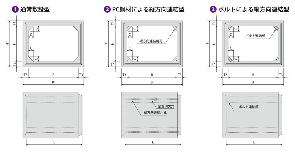 縦方向連結型は、下図に示すように製品ブロックを設置した後に、縦方向をPC鋼材または高力ボルトにて連結する敷設方式です。この敷設方法は、止水性を確保したい場合や土かぶりが大きく変化する場合及び耐震構造でPC鋼材を必要とする場合に用います。なお、曲線部の場合は、高力ボルトによる連結方法によるのものとします。次のような場合は、ボックスカルバートの縦方向の連結を行うのが望ましいとされます。