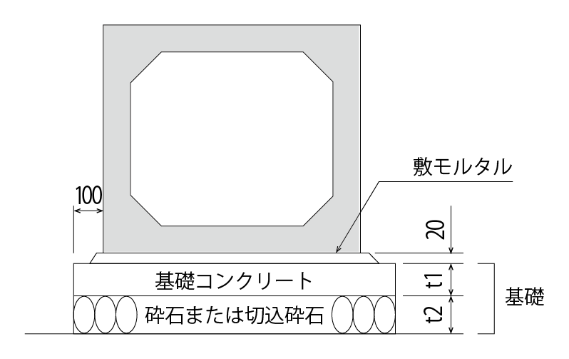 普通地盤の場合は、砕石を敷均した上にコンクリートを打設した基礎形式とします。なお、基礎の形状及び厚さは、下図及び下表を目安とします。