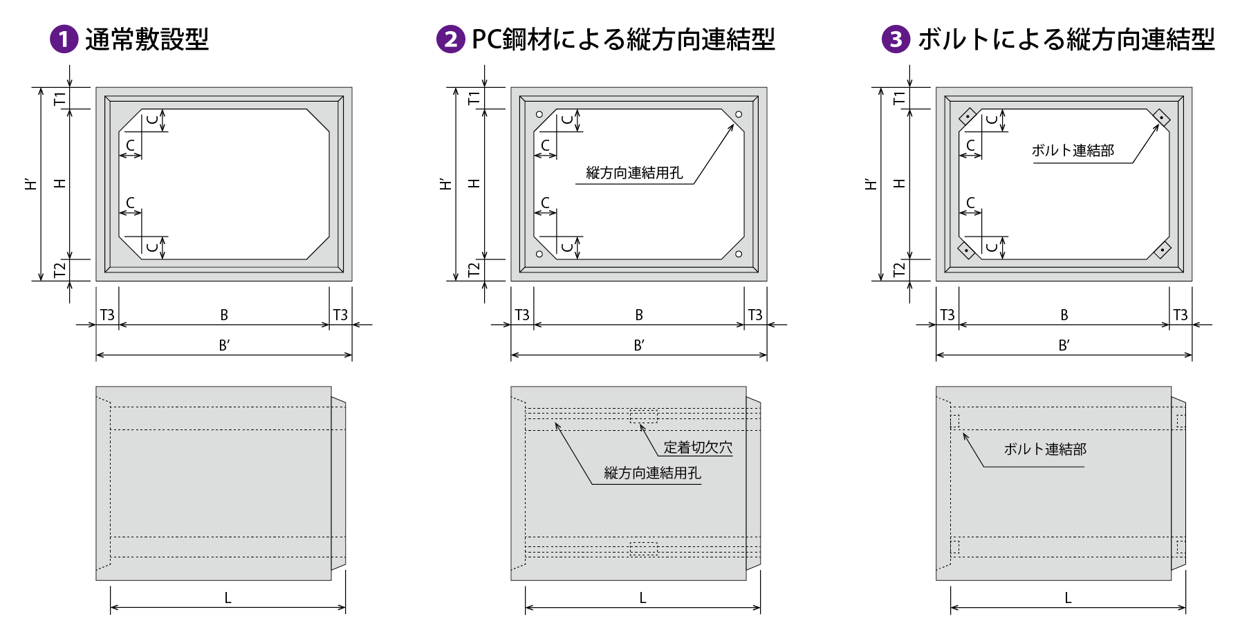 縦方向連結型は、下図に示すように製品ブロックを設置した後に、縦方向をPC鋼材または高力ボルトにて連結する敷設方式です。この敷設方法は、止水性を確保したい場合や土かぶりが大きく変化する場合及び耐震構造でPC鋼材を必要とする場合に用います。なお、曲線部の場合は、高力ボルトによる連結方法によるのものとします。次のような場合は、ボックスカルバートの縦方向の連結を行うのが望ましいとされます。