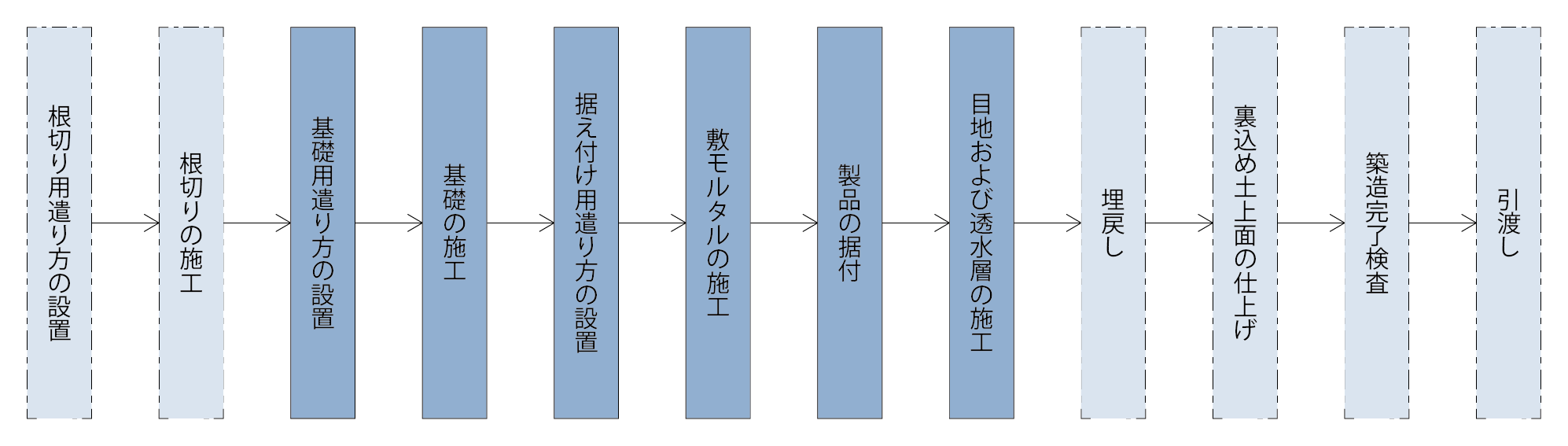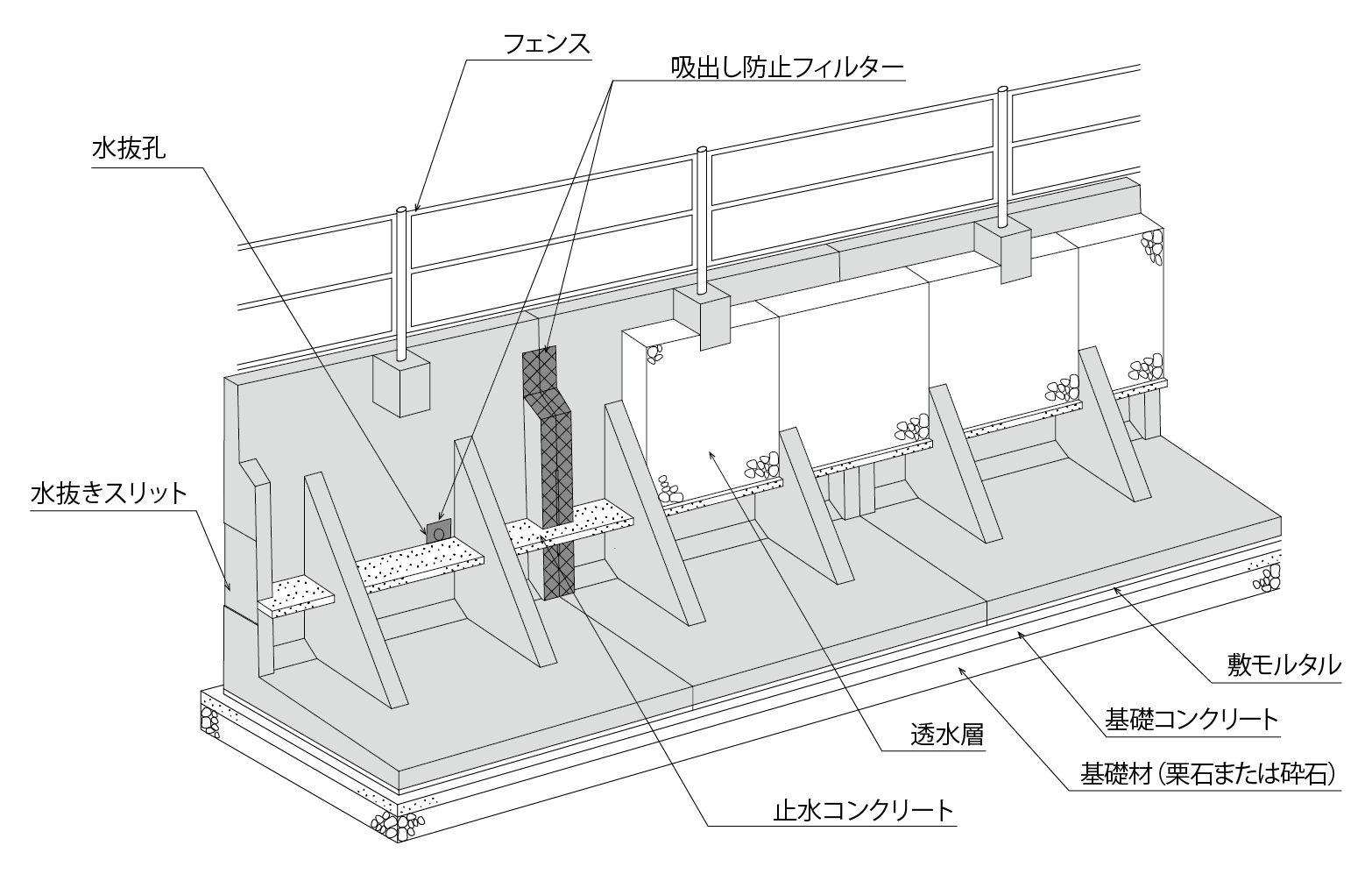 法止ブロックFL-AⅡの施工については、築造に関する基準が築造仕様書に定められています。一般的注意事項として次の項目が記載されています。