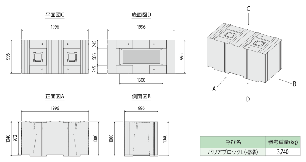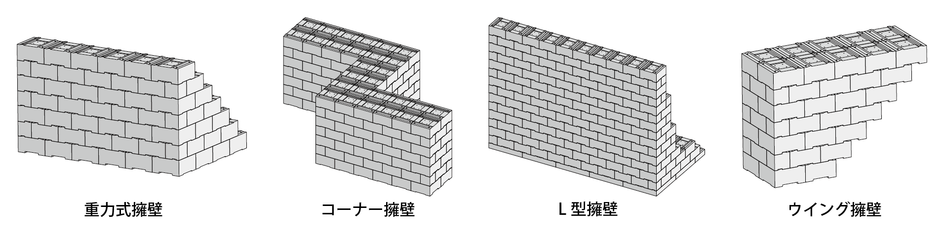 L型・重力式・もたれ式・積みブロック・ウイング・コーナーなど形状が 変化する常設/ 仮設が可能な土留めブロックです。