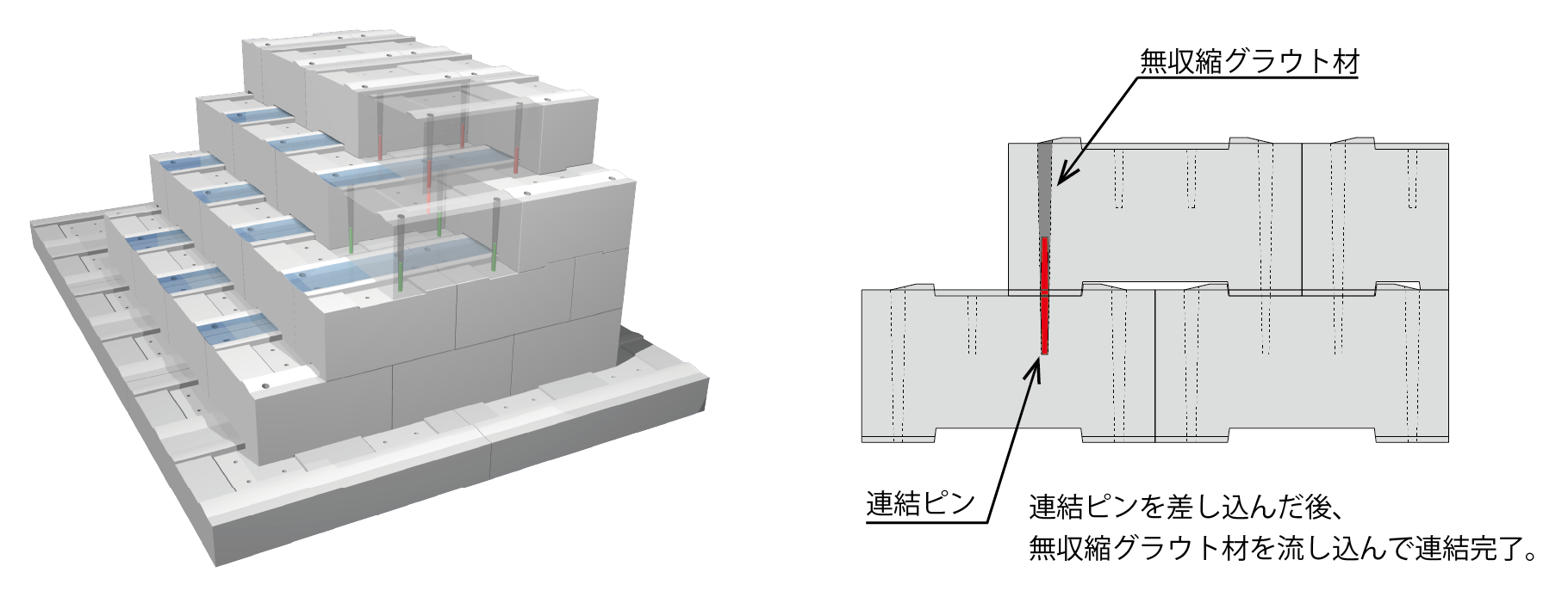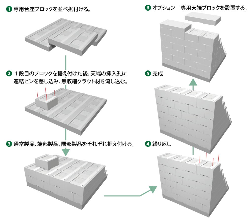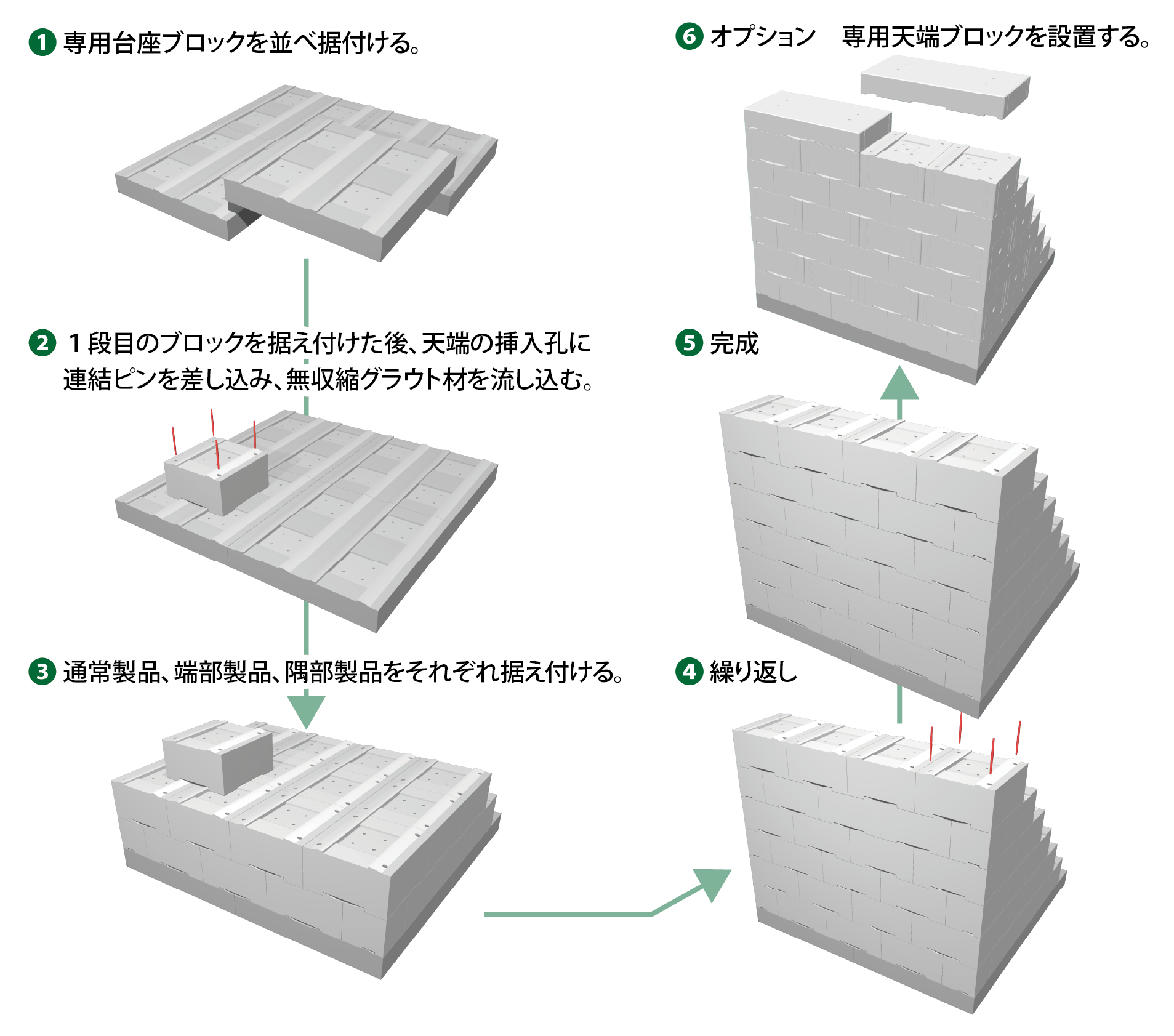 1. 積み上げと連結ピンの設置だけの簡単施工です。