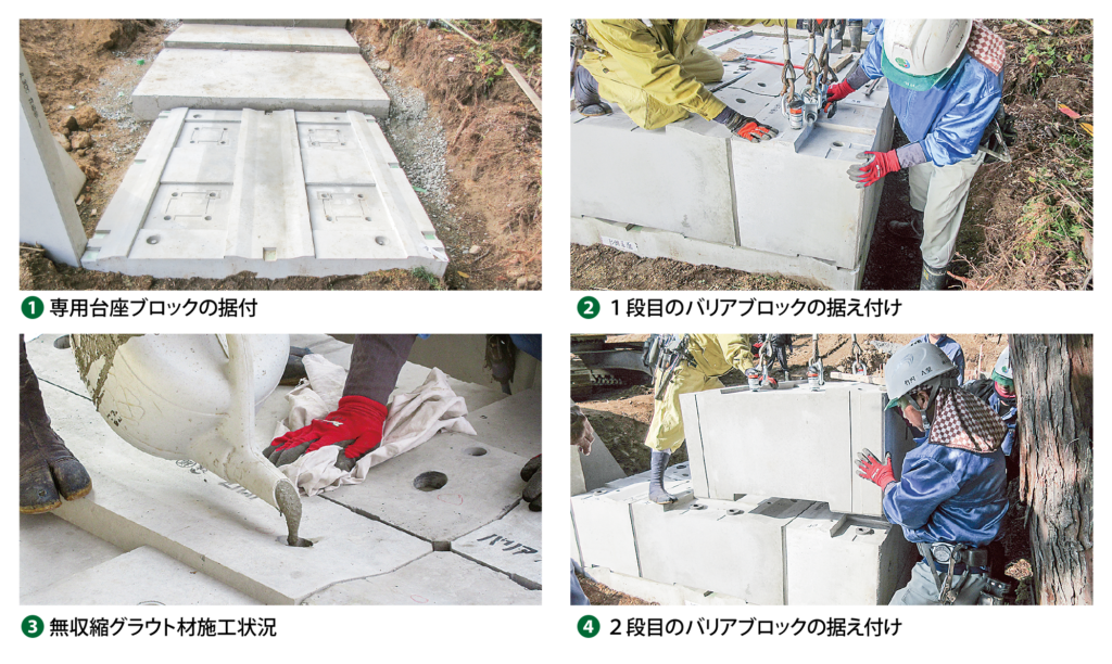 専用台座ブロックを使用することにより正確にバリアブロックを積み上げ施工することが可能となります。